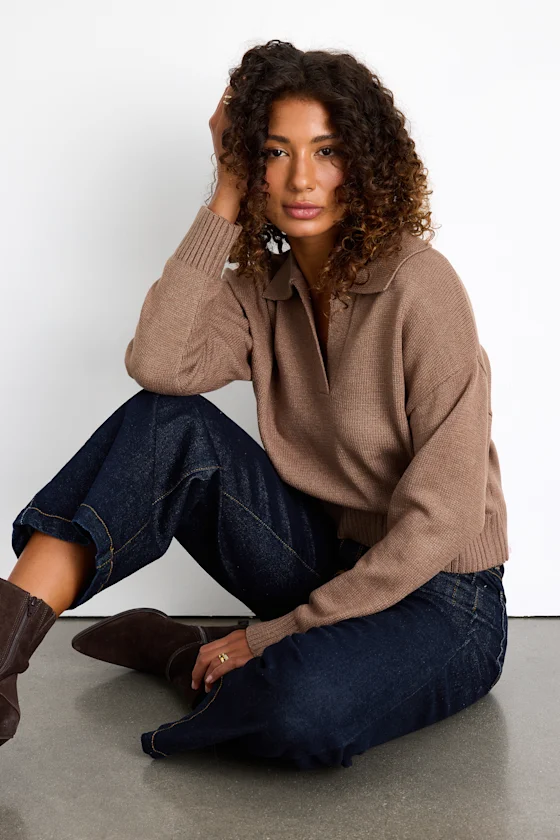 When the weather report starts foreseeing chillier days, you’ll know it’s time to pull out cuddly looks like the Thewearstyles Cozy Forecast Light Brown Collared Pullover Sweater! Medium-gauge knit shapes this totally cute sweater, featuring a chic collared neckline and long sleeves with drop shoulders. The boxy, roomy bodice falls to a slightly cropped hem. Contrasting ribbed knit accents the cuffs and hem.