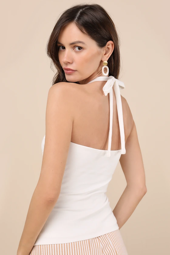 Cute nights out on the town call for flirty ‘fits that include the Thewearstyles Ikuye Ivory Ruched Halter Top! This must-have top has a ponte knit fabrication that shapes a tying halter neckline that supports a sweetheart-style bodice with flattering ruching down the center and sides. Pair this backless look with all your favorite denim bottoms!
