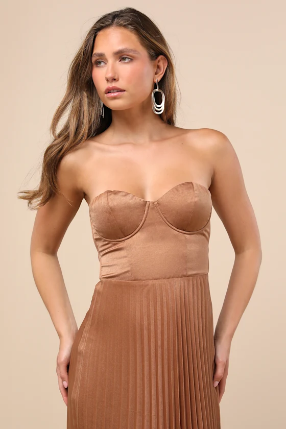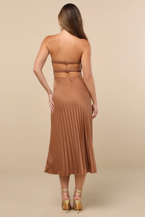 A well-known, best-dressed guest like you will very much approve of this sleek satin dress, complete with a strapless, bustier-inspired bodice with supportive underwire and elasticized straps that lay across the open back. The flowy, pleated A-line dress falls to a breezy midi hem for the chicest finish. Hidden side zipper/clasp.