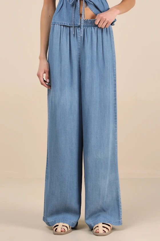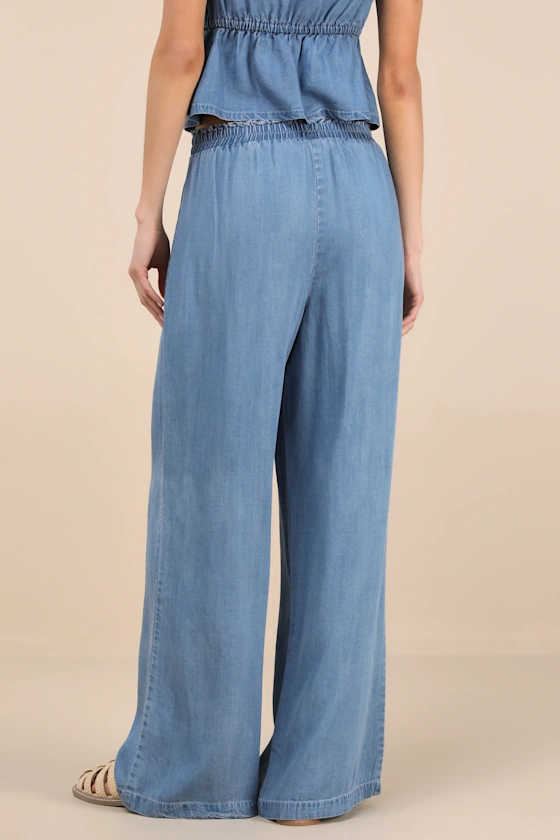 A carefree day comes effortlessly when you style these breezy, chambray pants that feature a high-rise fit with an elasticized waistband. The wide pant legs offer the most comfortable wear as they fall to full-length hems. Pair with the matching top for a complete look!