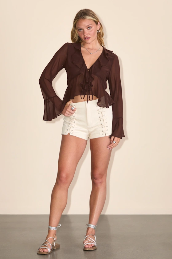 Edgy looks this season come together in an instant with essential pieces like these linen-like woven shorts. Besides the classic high-rise waist that everyone knows and loves, the lace-up detailing across the front will have them instantly impressed the moment you walk into a room. Hidden clasp closure and zip fly complete the look. Elastic at back.