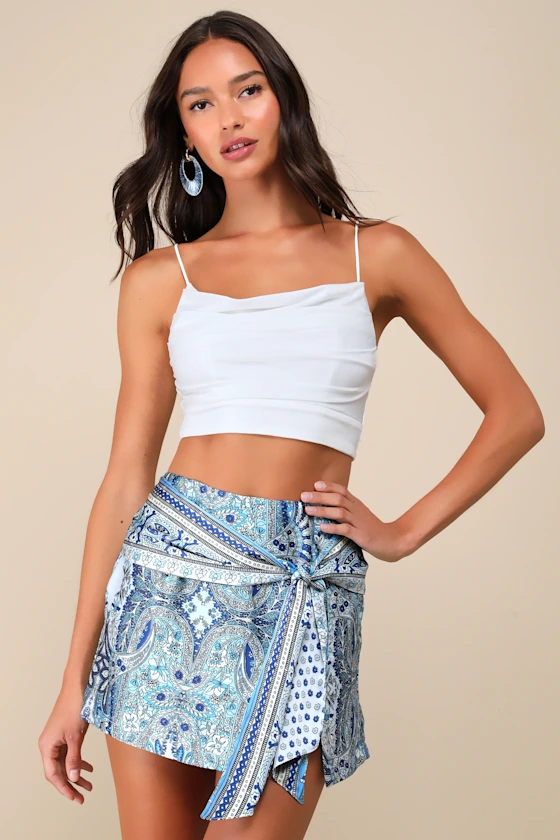 Let your style tell a story near and far in the Thewearstyles Trendy Tales Blue Multi Scarf Print Satin Tie-Front Skort! Lightweight woven satin, with a scarf print in varying hues of blue, ivory, and yellow throughout, shapes a fitted waist above a cute skort overlay. Overlapping front panels carry into a tie-front detail before falling to a mini hem with a flirty front slit.